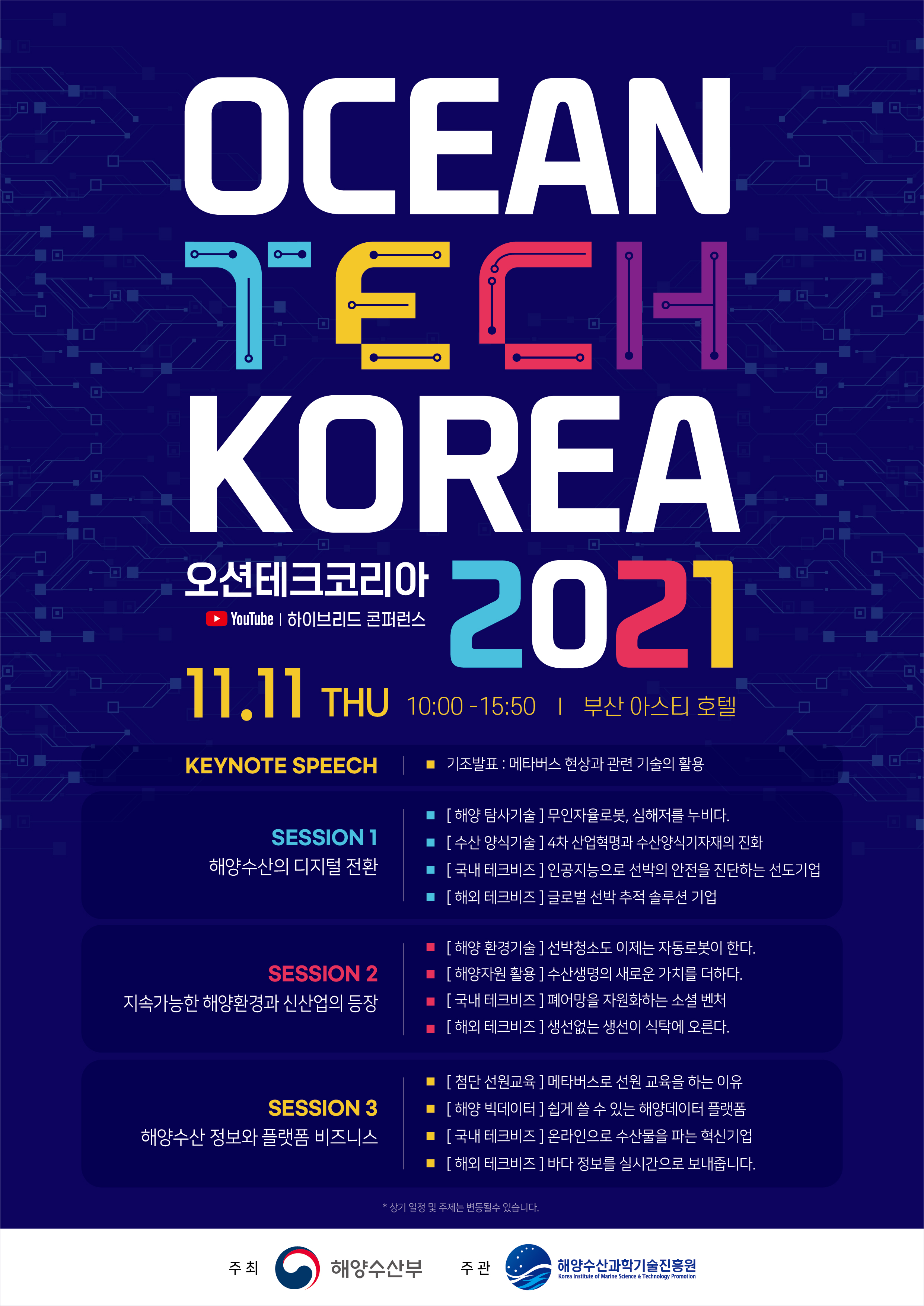 본 행사는 세가지 주제의 세션과 기조강연 등 총 13개의 강연으로 구성되어 있으며, 국내외 연사들과 최신 기술 동향 및 사례를 공유하며 해양 수산과 관련된 혁신 기술 등 좋은 네트워킹의 자리가 될 것으로 생각됩니다