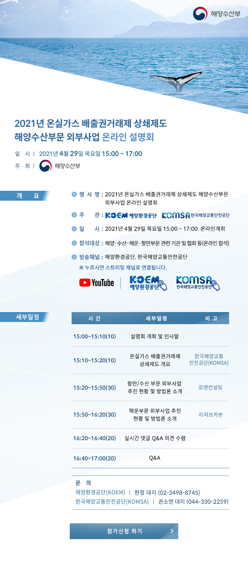 해양환경공단에서 주관하는 2021년 온실가스 배출권거래제 상쇄제도 해양수산부문 외부사업 온라인 설명회를 아래와 같이 개최합니다.