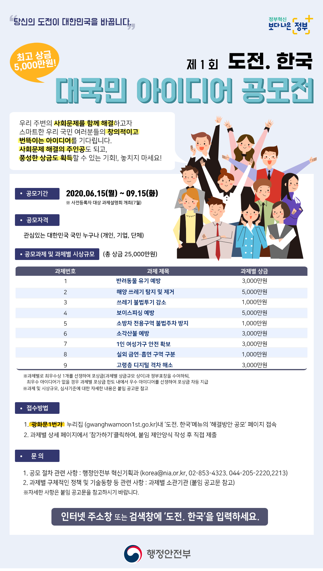 해양수산부에서 국민의 창의성과 집단지성을 활용하여 사회 문제 해결을 위해 국민의 창의적인 아이디어를 모집하는 제1회 [도전, 한국] 아이디어 공모전(총 9과제)이 2020년 6월 15일부터 9월 15일까지 진행 중에 있습니다.