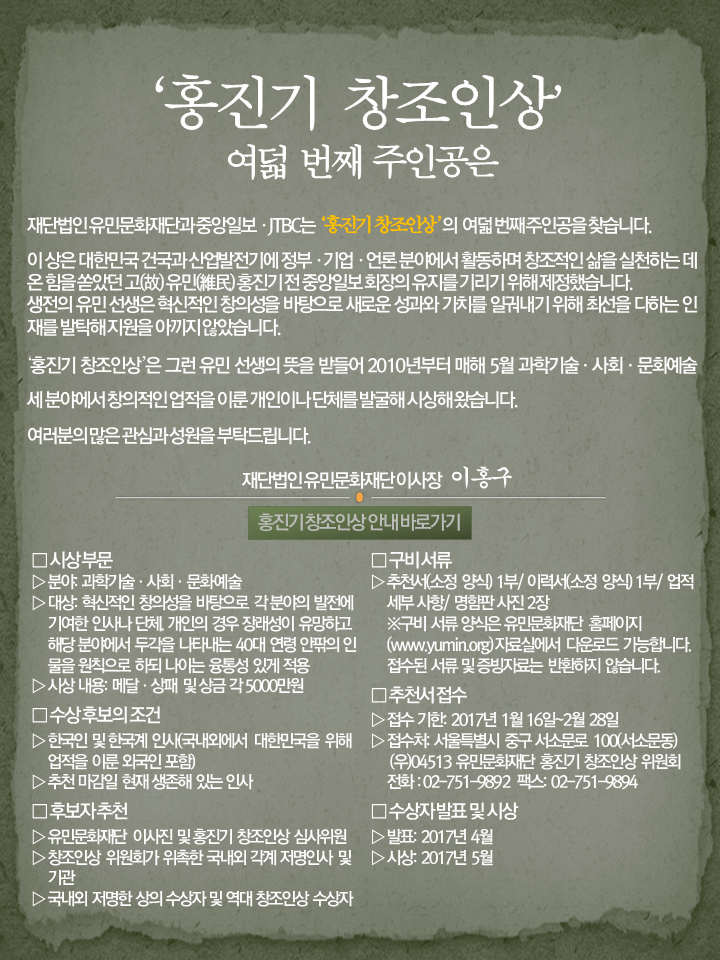 유민문화재단이 주관하는 ‘홍진기 창조인상’에 학회 소속의 우수한 과학기술 연구자가 많이 응모하실 수 있도록 관련 내용을 안내해 드리오니