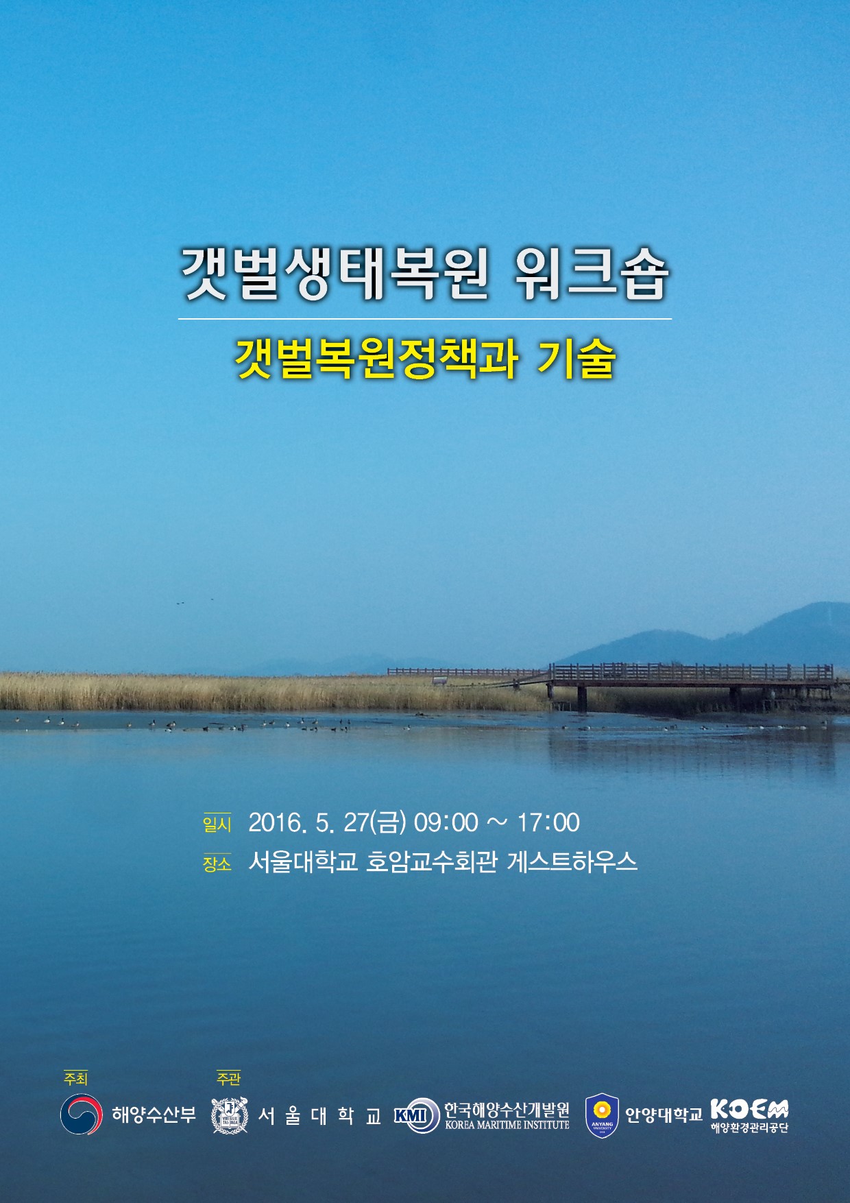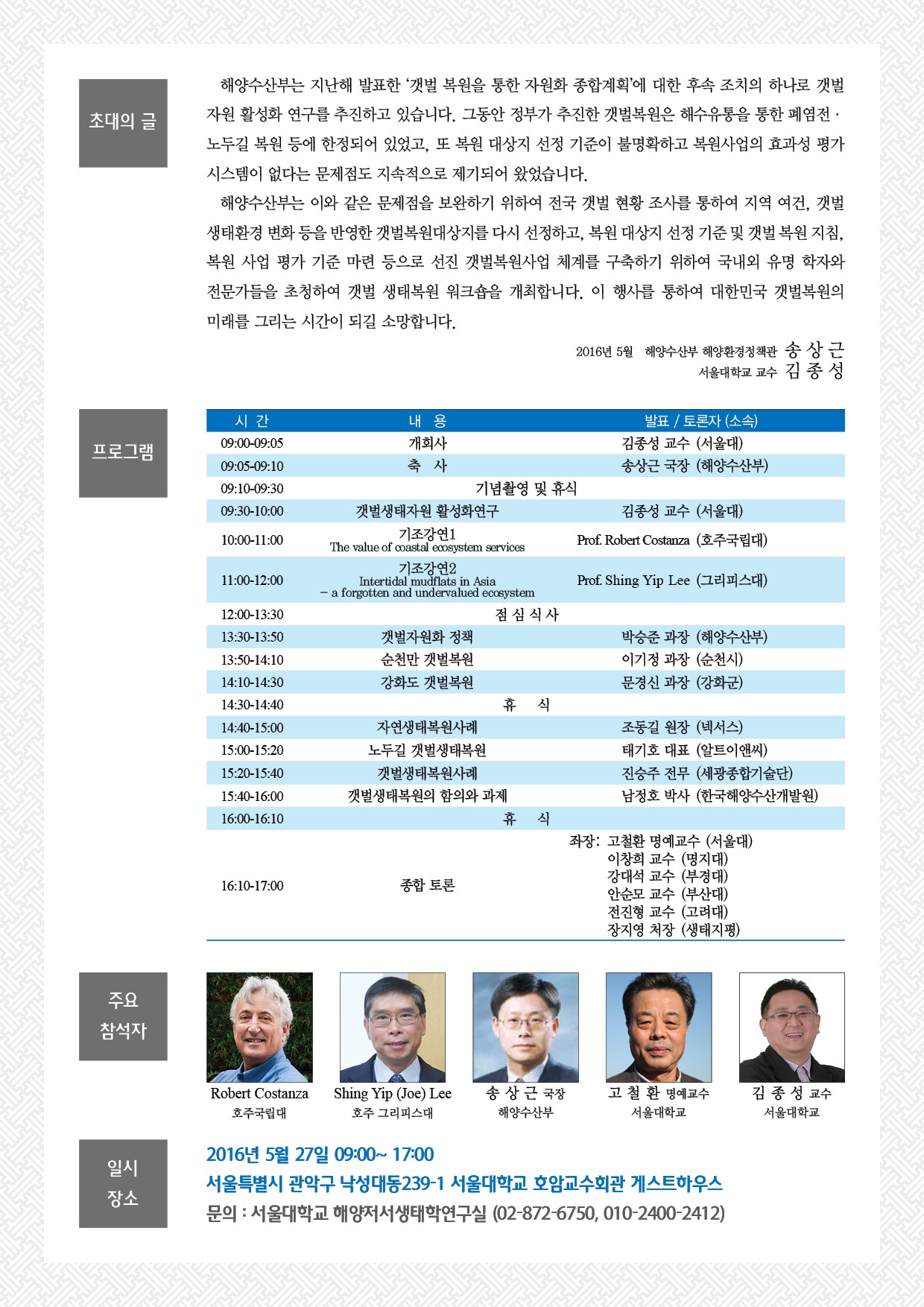 해양수산부에서 추진 중인 '갯벌생태자원 활성화연구'의 일환으로 '갯벌생태복원 워크숍: 갯벌복원정책과 기술'을 아래와 같이 개최합니다. 금번 워크숍에는 생태계서비스 분야의 세계적인 석학 Robert Costanza 교수(호주국립대)의 기조강연이 예정되어 있습니다. 많은 관심 부탁드립니다.