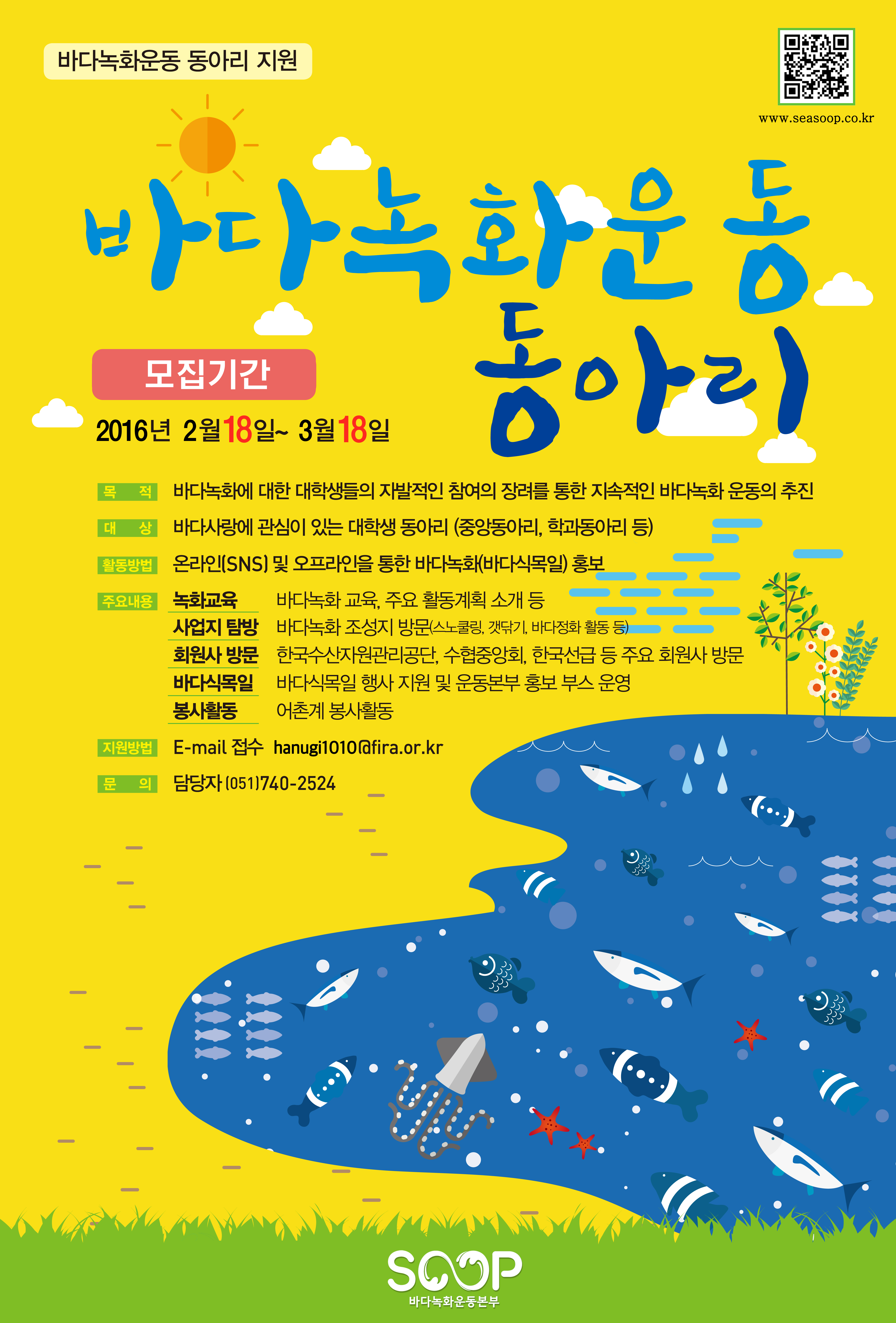 사)바다녹화운동본부는 바다식목일(매년 5월 10일) 행사의 전 국민 참여기반 조성을 위한 활동을 수행하는 법인으로, 바다사랑을 실천할 대학생 바다녹화 서포터즈를 모집 중에 있습니다.