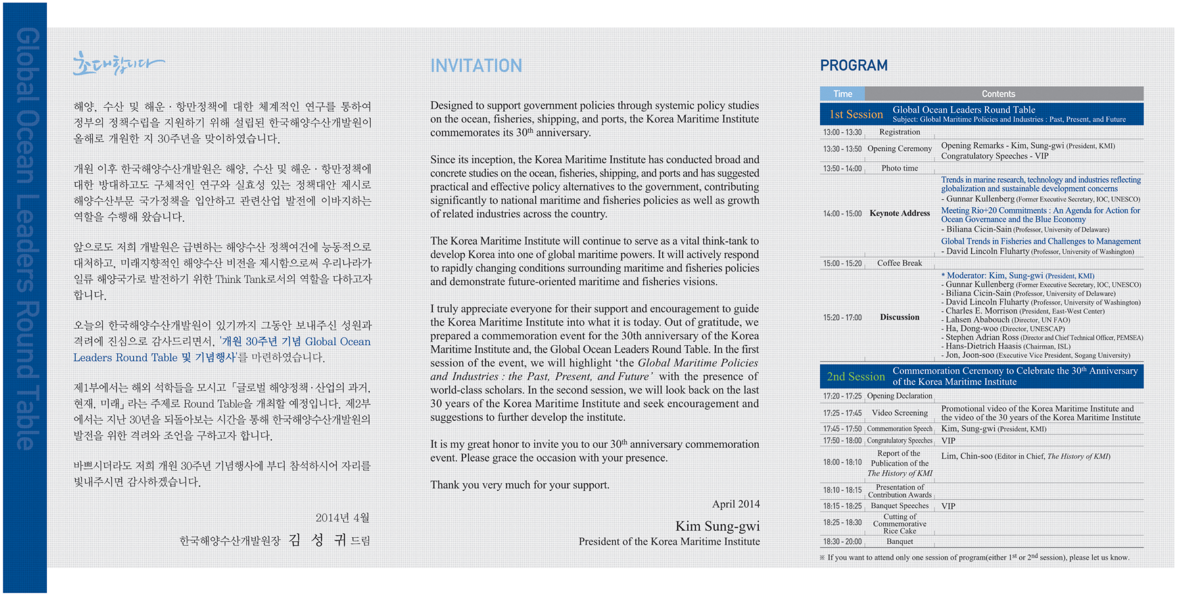 2014년 4월 17일 목요일에 세종문화회관 세종홀에서 13:00 ~ 17:00 까지 진행되는 제 1부 에서는 해외석학들을 모시고 <글로벌 해양정책 및 산업의 과거, 현재, 미래> 라는 주제로 Round Table을 개최할 예정입니다. 이어 17:20 ~ 20:00 까지 진행되는 제 2부에서는 개원기념식과 만찬이 예정되어 있습니다.